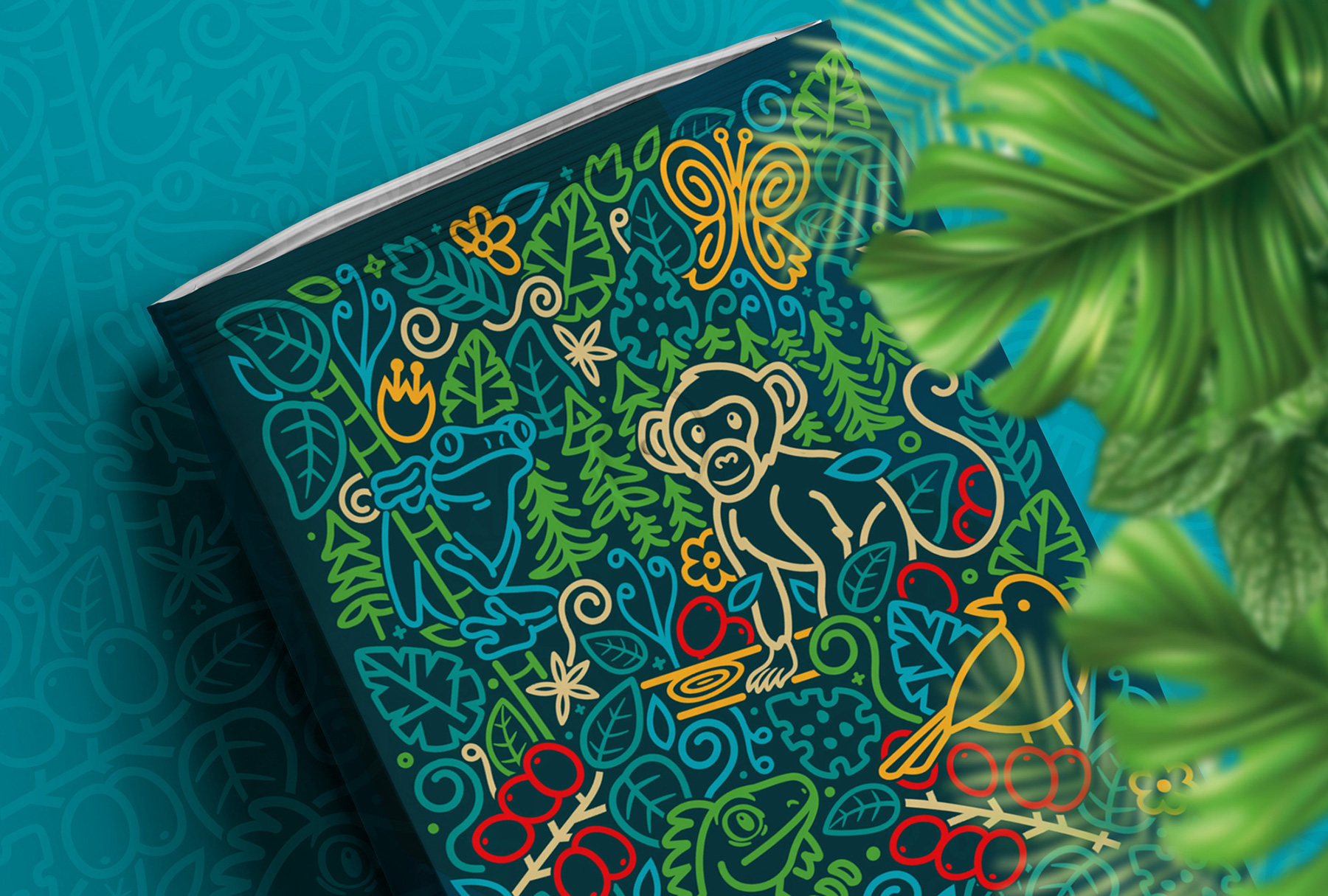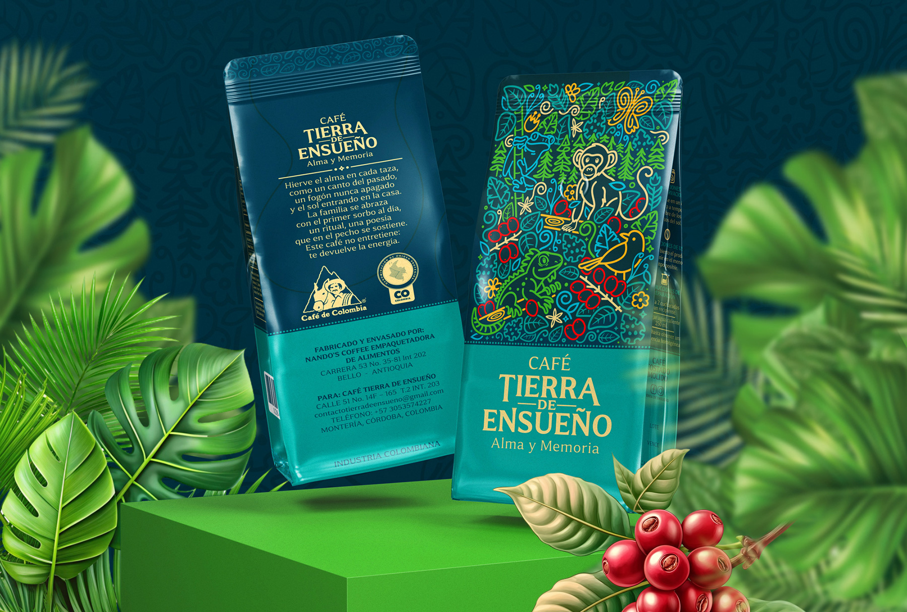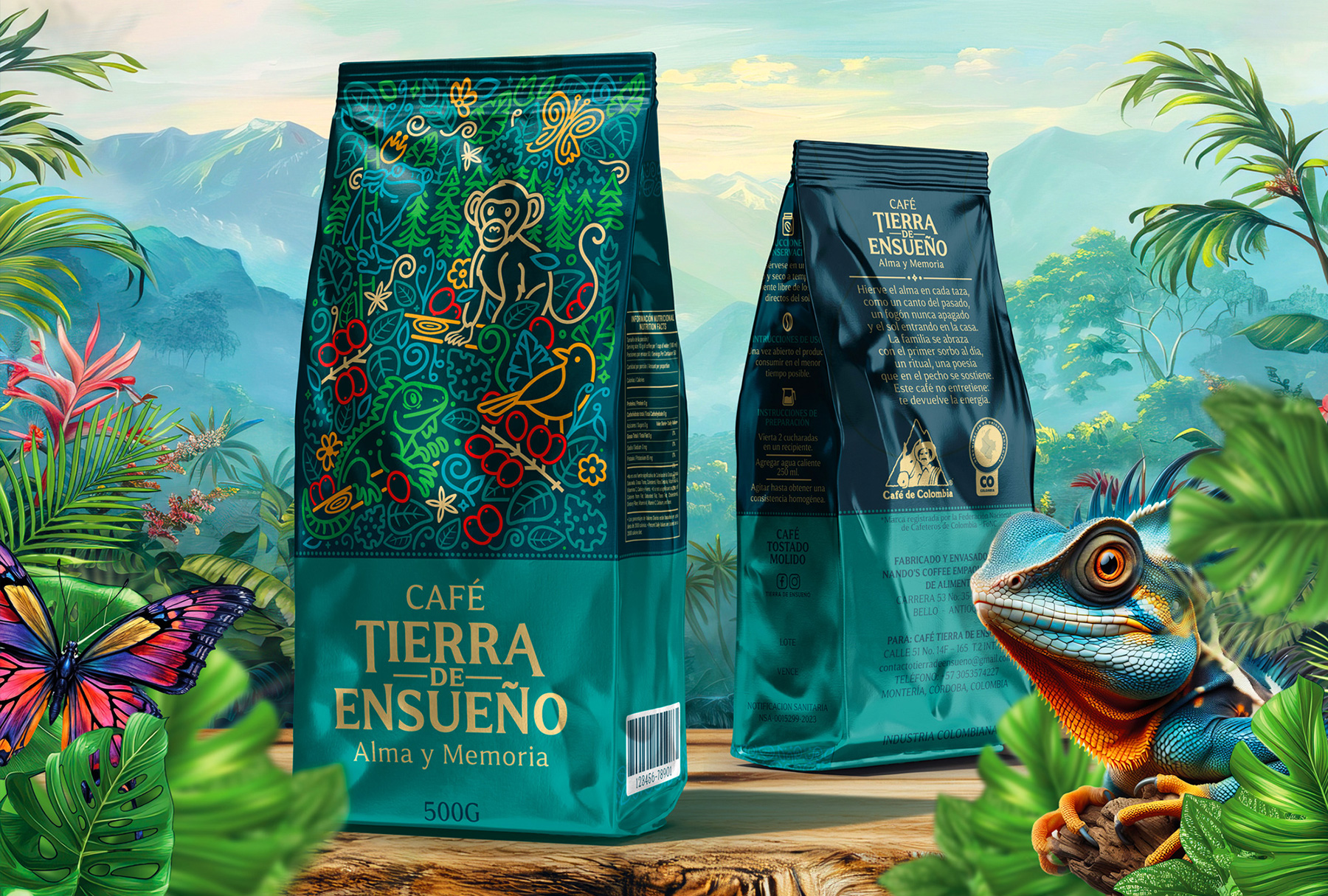 La ilustración esta compuesta por trazos continuos, fluidos y coloridos, funciona como un mural narrativo que celebra la riqueza natural del entorno cafetero. En ella conviven: Un mono que simboliza vitalidad, curiosidad y equilibrio ecológico. Aves, mariposas y reptiles que representan la diversidad del ecosistema colombiano. Ramas, hojas y frutos de café que conectan directamente con la cadena productiva y con los guardianes de la tierra. Este estilo lineal, casi pictográfico, mezcla arte tradicional con un lenguaje moderno. El patrón visual comunica movimiento, vida y un sentido de bosque profundo, convirtiendo cada bolsa en una pieza que cuenta una historia de origen y conexión ambiental.