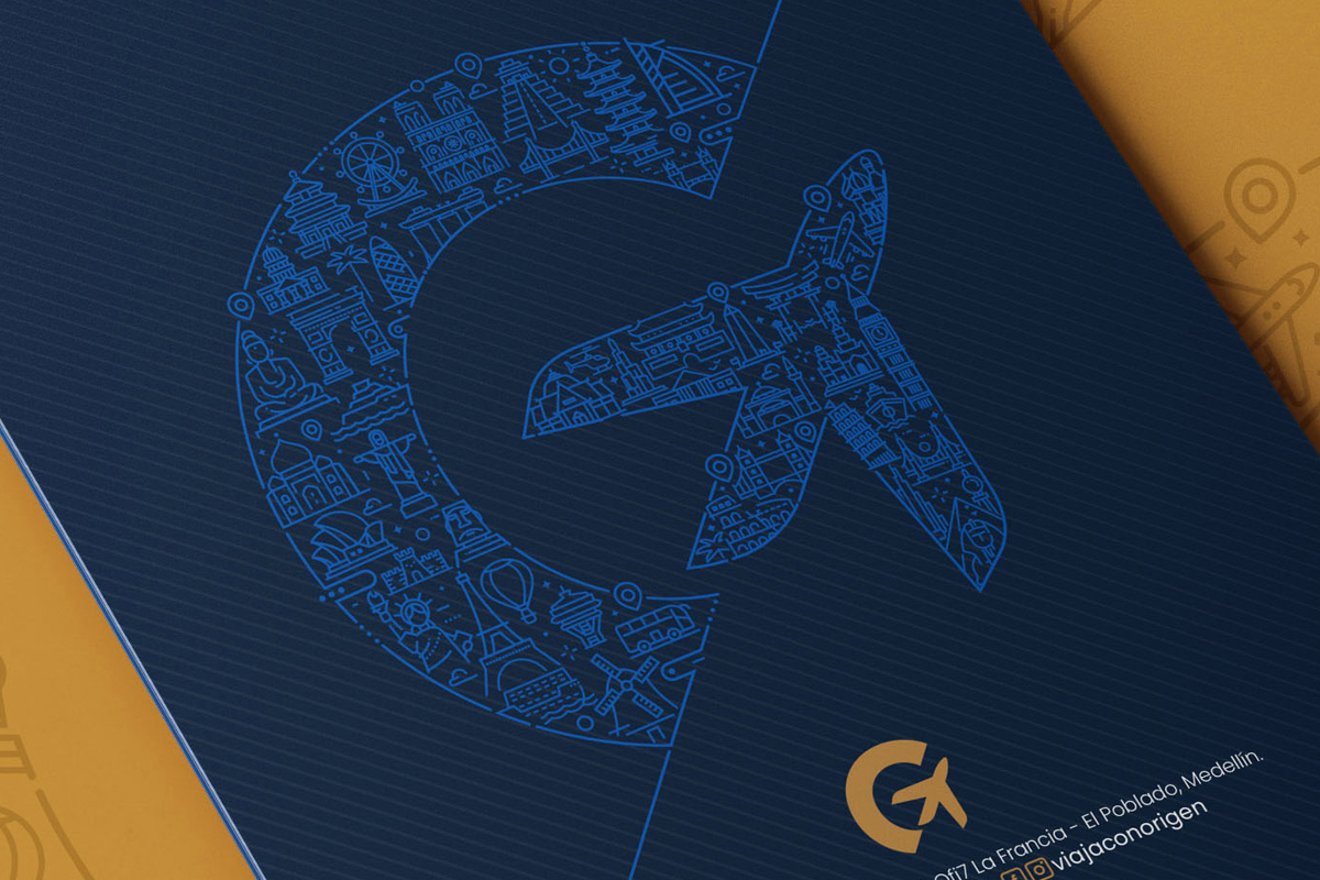 El isologo surge a partir de un avión integrado en el espacio negativo de la letra «G», representando viaje, descubrimiento y conexión global. Este recurso convierte una simple letra en un símbolo poderoso y memorable, alineado con la misión de la marca: invitar a redescubrir el mundo desde el origen de cada persona.